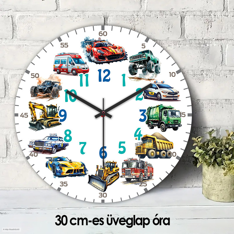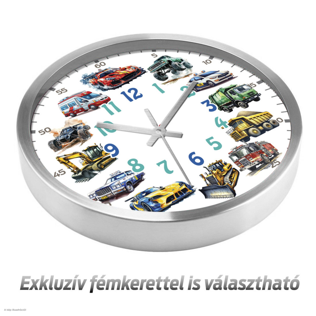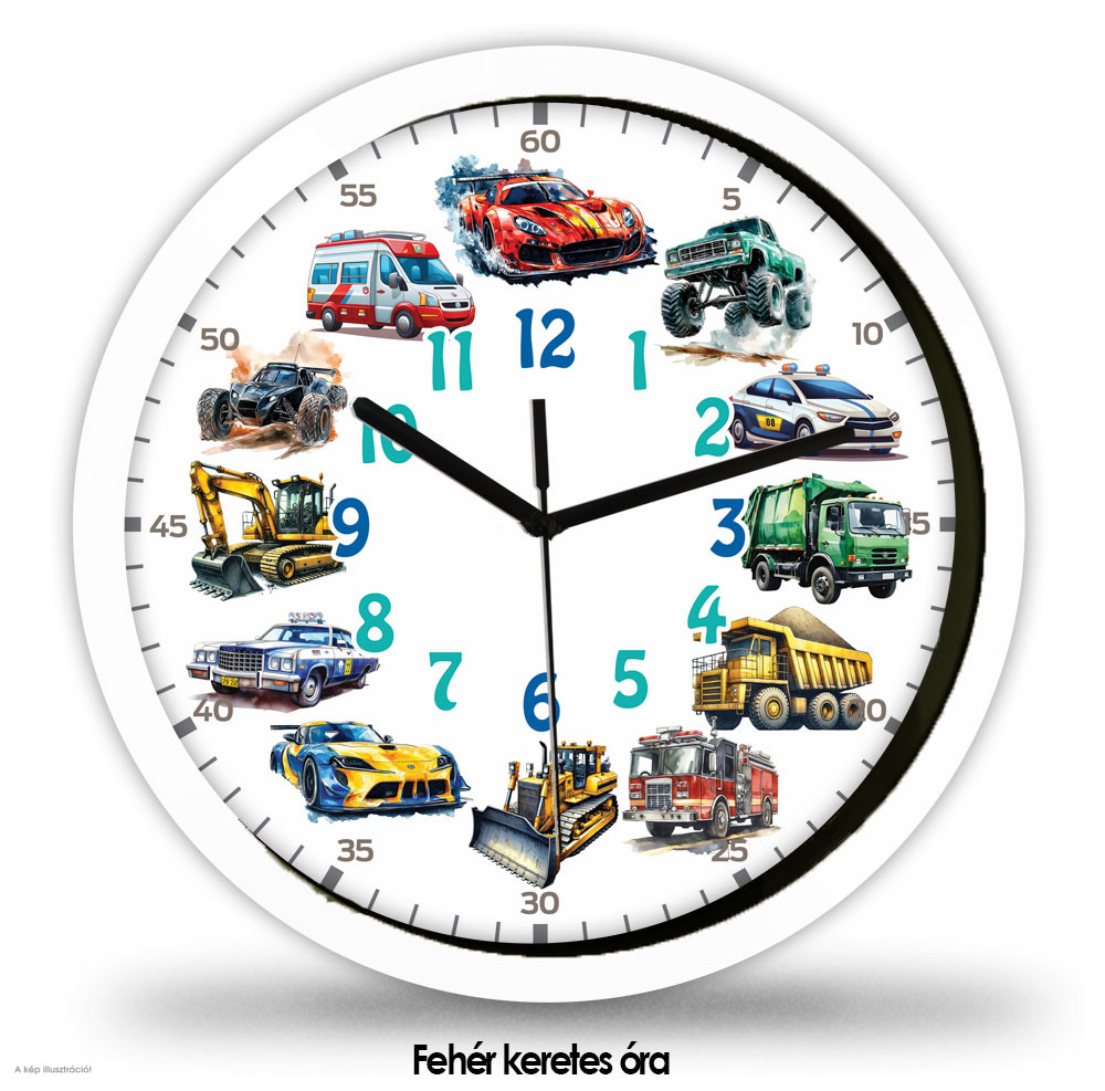 Dobd fel a gyerekszobát ezzel a látványos faliórával, amelyet különféle izgalmas járművek díszítenek. A számlapon sportautó, mentőautó, rendőrautó, tűzoltóautó, dömper, markoló, buldózer és terepjáró is helyet kapott, így tökéletes választás minden kisfiú és járműrajongó gyermek számára.